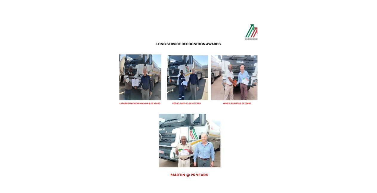 Congratulations to Lazarus, Pedro, Winesi and Martin on your Long Service Awards and Thank you for your continued commitment to Concrete Structure.